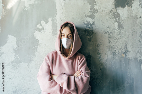 Unrecognizable discontent female in pullover and sterile mask standing with crossed arms near cement wall with shabby surface in flat and looking at camera during COVID 19 pandemic