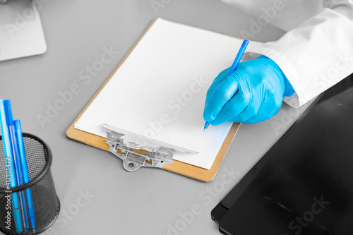 Unrecognizable doctor in gloves making notes while sitting at his working table