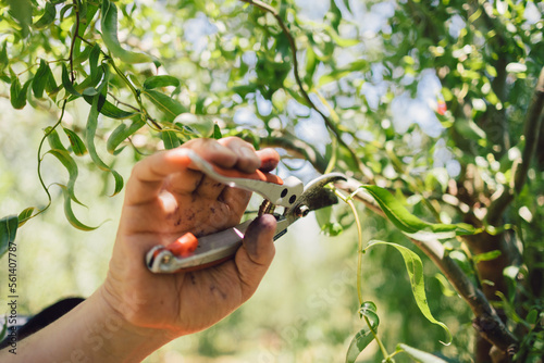 Unrecognizable man's hands pruning willow tree with pruning shears. Domestic occupation