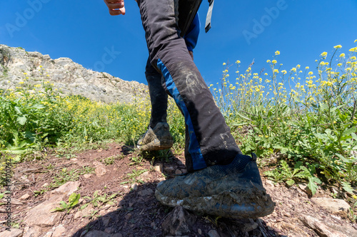 Unrecognized young boy wearing sports clothes doing trekking in the countryside.