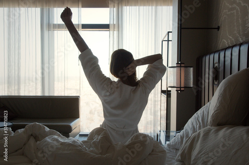 Upper body mobility, Beautiful young woman stretching on bed after waking up
