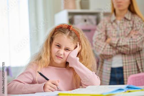 Upset daughter rests her head on hand, staring at camera, overwhelmed by homework, mother in background. School difficulties, emotional support, study pressure