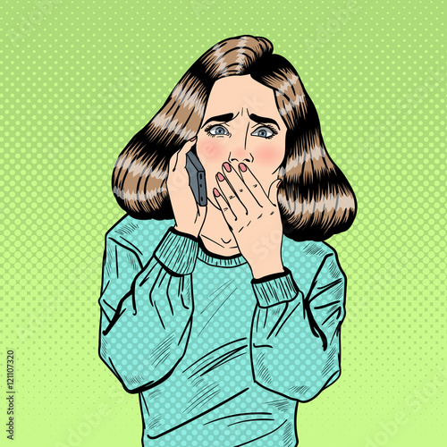 Upset Stressed Pop Art Woman Talking by the Cell Phone. Vector illustration