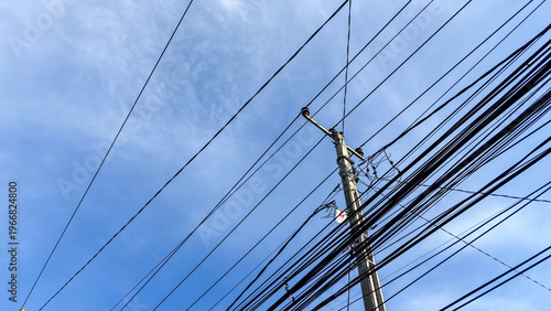 Upward view of electric power lines and utility pole crossing a blue sky representing infrastructure and connectivity.