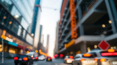 Urban Commute Through Cityscape: A blurred shot captures a bustling urban street lined with high-rise buildings, cars, and a sense of constant movement, suggesting a dynamic daily commute.