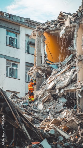 Urban disaster recovery efforts amid collapsed building after earthquake.