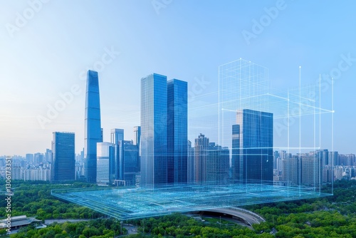 Urban Evolution: City Skyline Pixelation and Digital Blueprints Reflecting Smart City Development