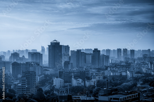 Urban Landscape in Serene Blue Tones Capturing City Life