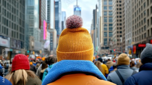Urban scene, a person with a colorful knit hat and an orange jacket, is viewed from behind, in the midst of a large crowd of people walking in a city