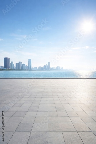 Urban skyline with serene waterfront.