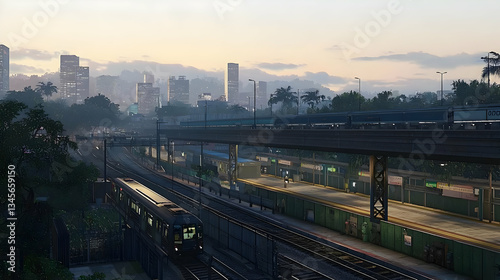 Urban Train Tracks At Sunrise In Cityscape