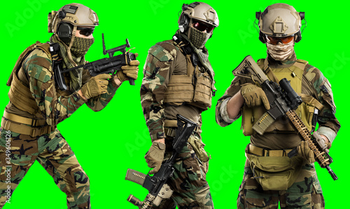 US marine corps soldier with rifle. Shot in studio. Isolated with clipping path on green chroma key background