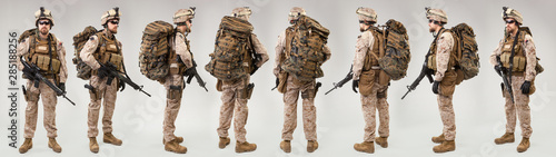 US marines forces soldiers with rifles on grey background. Shot in studio. Collage