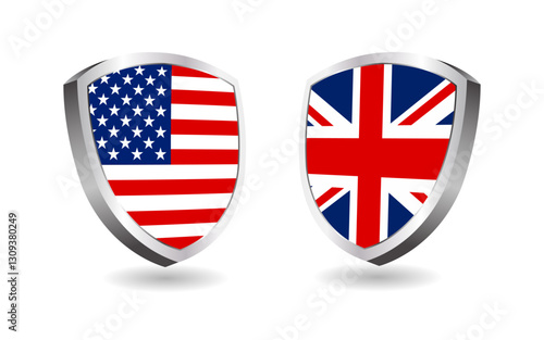 USA and UK flag shields on a white background, vector illustration