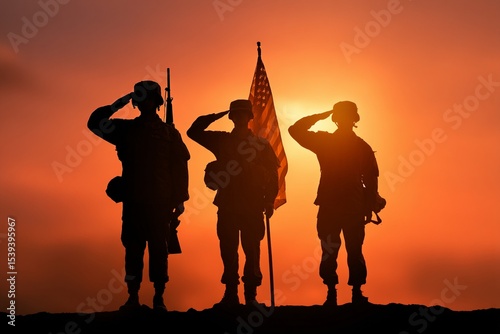 USA army soldiers saluting on a background of sunset or sunrise and USA flag.