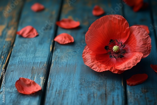 USA Memorial Day concept. USA Memorial Day concept of red remembrance poppy on dark blue vintage distressed wood table, with copy space