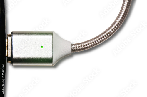USB cable, the cable is connected to the device. to close up. Concept of charging devices, dependence, energy and safety.