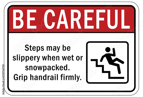 Use handrail sign and labels step may be slippery when wet or snow packed. Grip handrail firmly