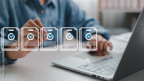 User completing online questionnaires and evaluations on laptop, with digital checkmark icons representing survey, exam, and feedback systems.