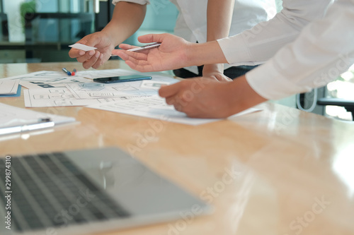 user experience UX designer designing web on smart phone layout. UI developer planning working on mobile application prototype