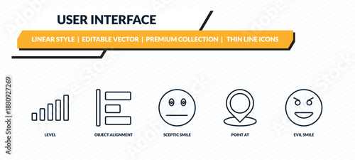 user interface icons set - level, object alignment, sceptic smile, point at, evil smile outline vector collection.