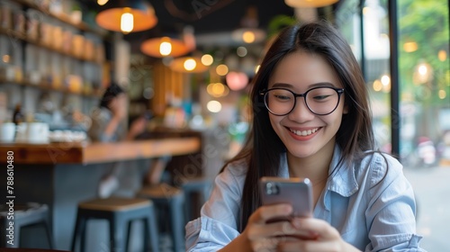 Using her smartphone brings a bright smile to the young woman's face.