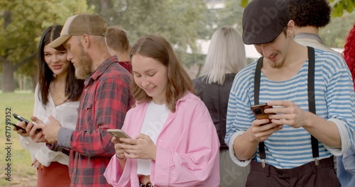 Using mobile internet. Social Gathering. Portrait friends engaging conversation, young adults talking Sharing online using phone. Bearded man talking black hair woman.