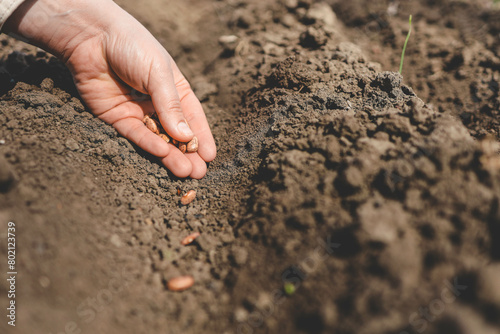 Using their thumb, a person plants seeds in the soil with a gentle gesture