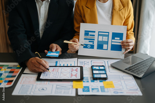 UX graphic designer planning application process development prototype wireframe for web smart phone. Creative digital development agency..