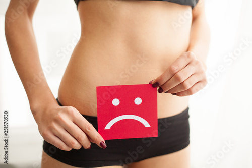 Vaginal or urinary infection and problems concept. Young woman holds paper with SOS above crotch