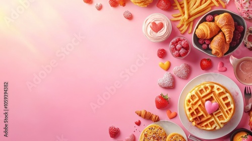 Valentine day brunch menu background with various breakfast and lunch dishes, waffle, croissant, muffins, donuts, berries, fries scrambled eggs, pancakes, with generative ai
