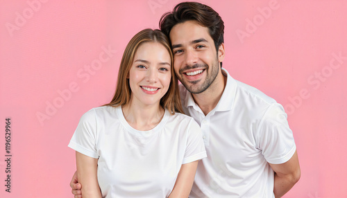 Valentine Vibes: Matching Outfits for Couples concept. Happy Young Couple Smiling Together on a Pink Background
