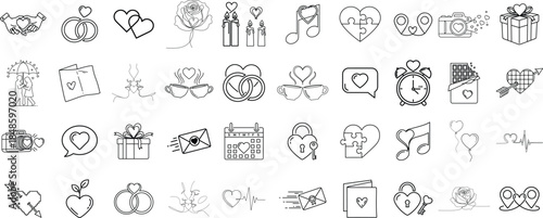 Valentine's Day and Love Line Icon Set: Vector Illustration of Hearts, Gifts, Flowers, Cupid, Rings, and Romantic Symbols for Wedding, Anniversary, and Greeting Card Design