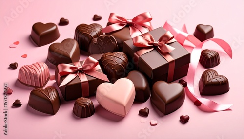 Valentine’s Day Chocolate Gift Box with Ribbon on Pink Cute Background / バレンタインチョコレートのギフトボックスとリボン、ピンク背景でキュートに