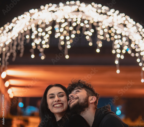 Valentine's Day content, two sweet couples are flirting and they hug and kiss. Valentine's day concept pose.