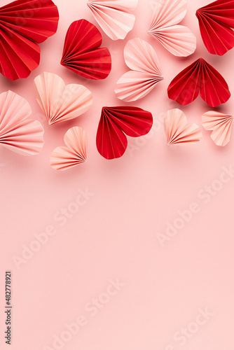Valentines day, hearts love background for marriage celebration - beautiful pink, red paper ribbed hearts in origami style fall on pastel pink color as header border, copy space, top view, vertical.