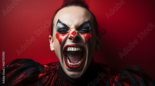 vampire on the red studio background, Vampire wide open mouth screams, Halloween outfit