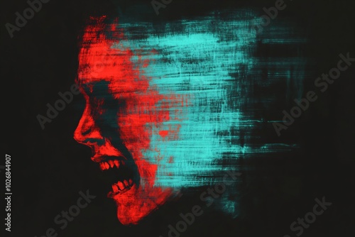 Vampire screaming on dark background with glitch and noise effect. Scary Halloween monster. Mental disorder, depression or bipolar. Horror and psychological thriller concept. Scary zombie character