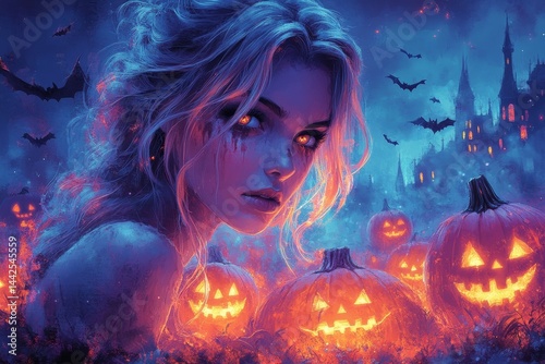 Vampire woman amidst glowing pumpkins, Halloween night castle