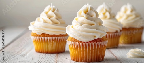 Vanilla cupcakes with cream cheese frosting displayed on a white wooden surface with selective focus and copy space image