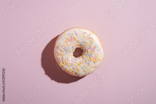 Vanilla donut with sprinkles, sweet glazed dessert food on pink minimal background, top view copy space