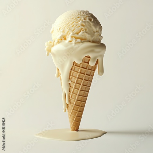 Vanilla ice cream cone melting isolated on white background