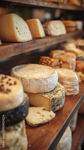 Variety of Artisan Cheeses Displayed on Rustic Shelves