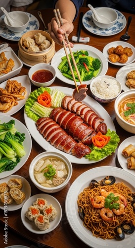 Variety of Asian dishes on table.