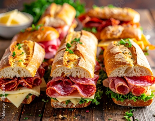 Variety of deli sandwiches featuring salami, ham, and cheese, arranged for serving