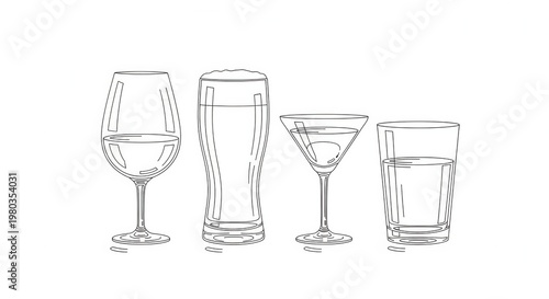 Variety of empty and filled drink glasses outline illustration