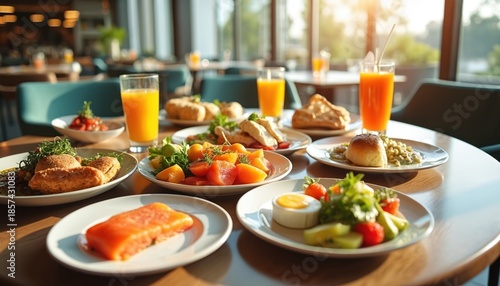 Variety of fresh dishes arranged on wooden table in bright restaurant interior. Healthy meal with salmon, fruits, vegetables and juices served for brunch.