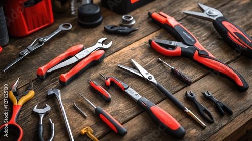 Variety of Hand Tools Arranged Neatly on a Rustic Wooden Table