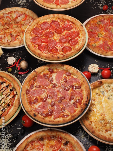 Variety of pizza on the table, top view