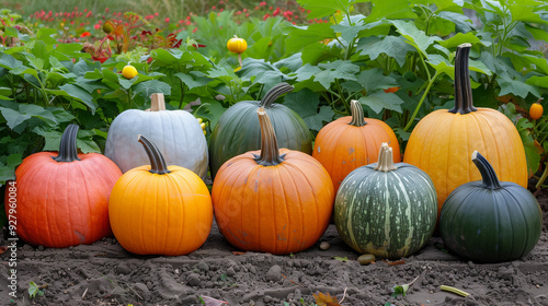 Variety of Pumpkins in a Garden. A colorful assortment of pumpkins of various sizes and colors arranged in a garden setting with green leaves and flowers in the background.